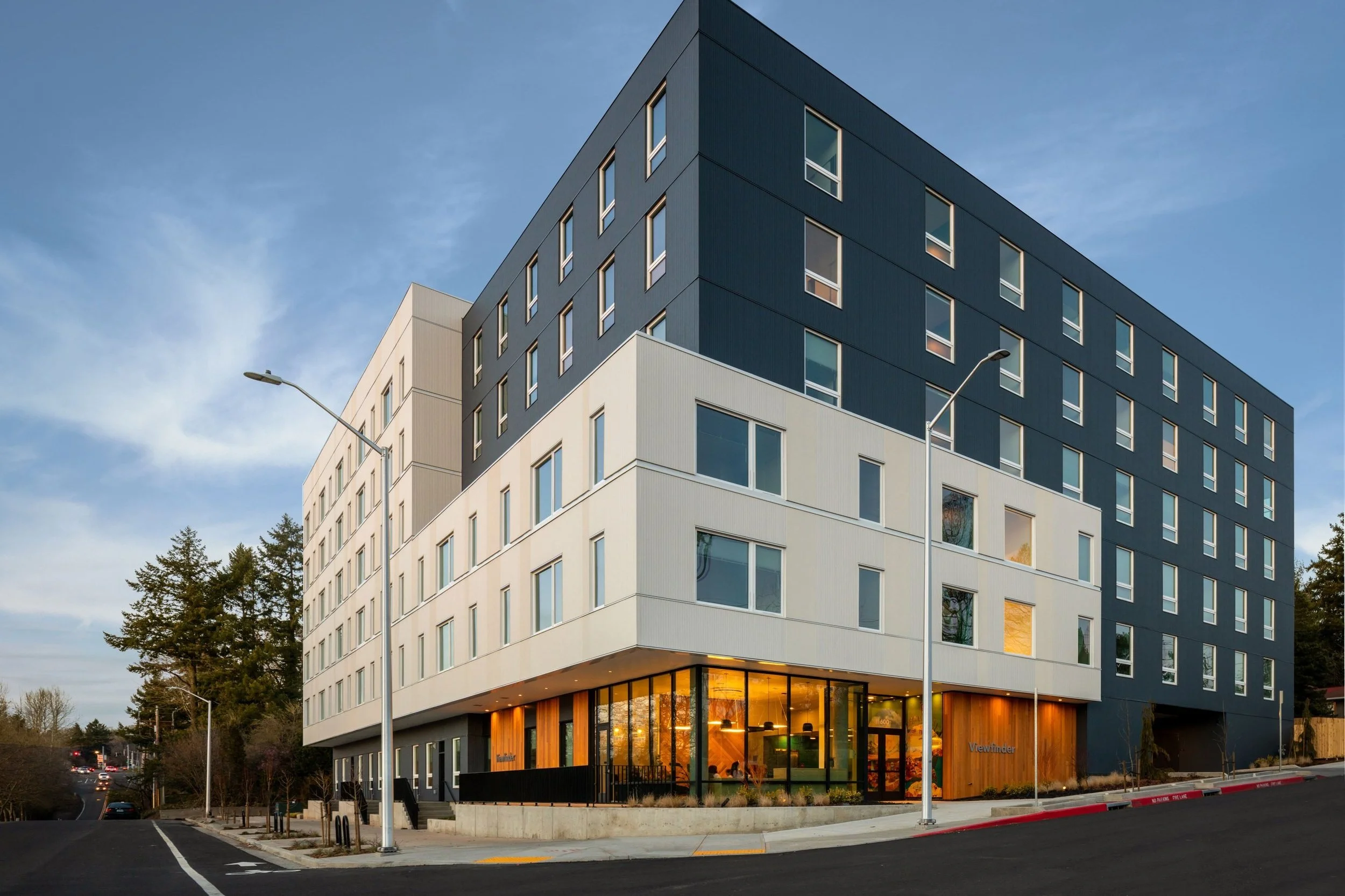 Viewfinder Apartments integrates architecture, art, and localism to address socio-economic gaps and offer moments of healing and discovery for residents. Viewfinder is Earth Advantage Platinum Certified and features a 38.4kW rooftop PV array that, along with other performance measures, offsets 80% of annual house energy use. The design approach applies humble materials inventively to maximize the potential of both the interior and exterior. Its urban edge is balanced with oasis-like communal outdoor spaces which utilize the building’s form to shade residents from the summer sun.