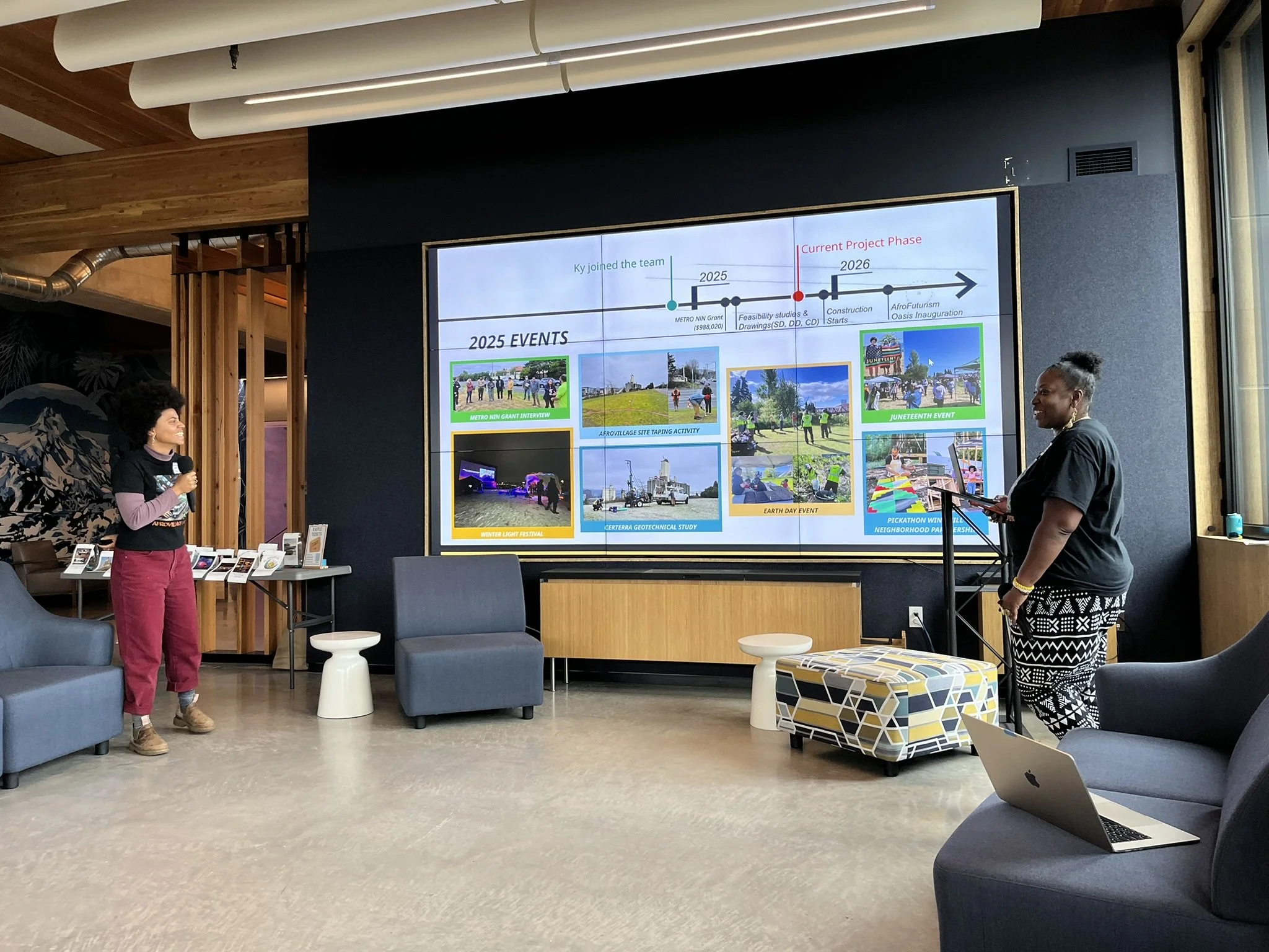AfroVillage PDX provided attendees with an update on the progress of their AfroFuturism Oasis project, a community resilience hub to empower the Black and Brown communities located in Portland’s Albina neighborhood. SEA volunteered with AfroVillage last Spring to help clean up and prepare their site for the Trimet trains that will serve as the hub’s buildings. SEA’s Associate Principal Tom Byrne, Interior Designer Jay Thornberry, and Juliette all attended, and they were inspired to hear that the project is coming together and going in for permit by the end of the year.