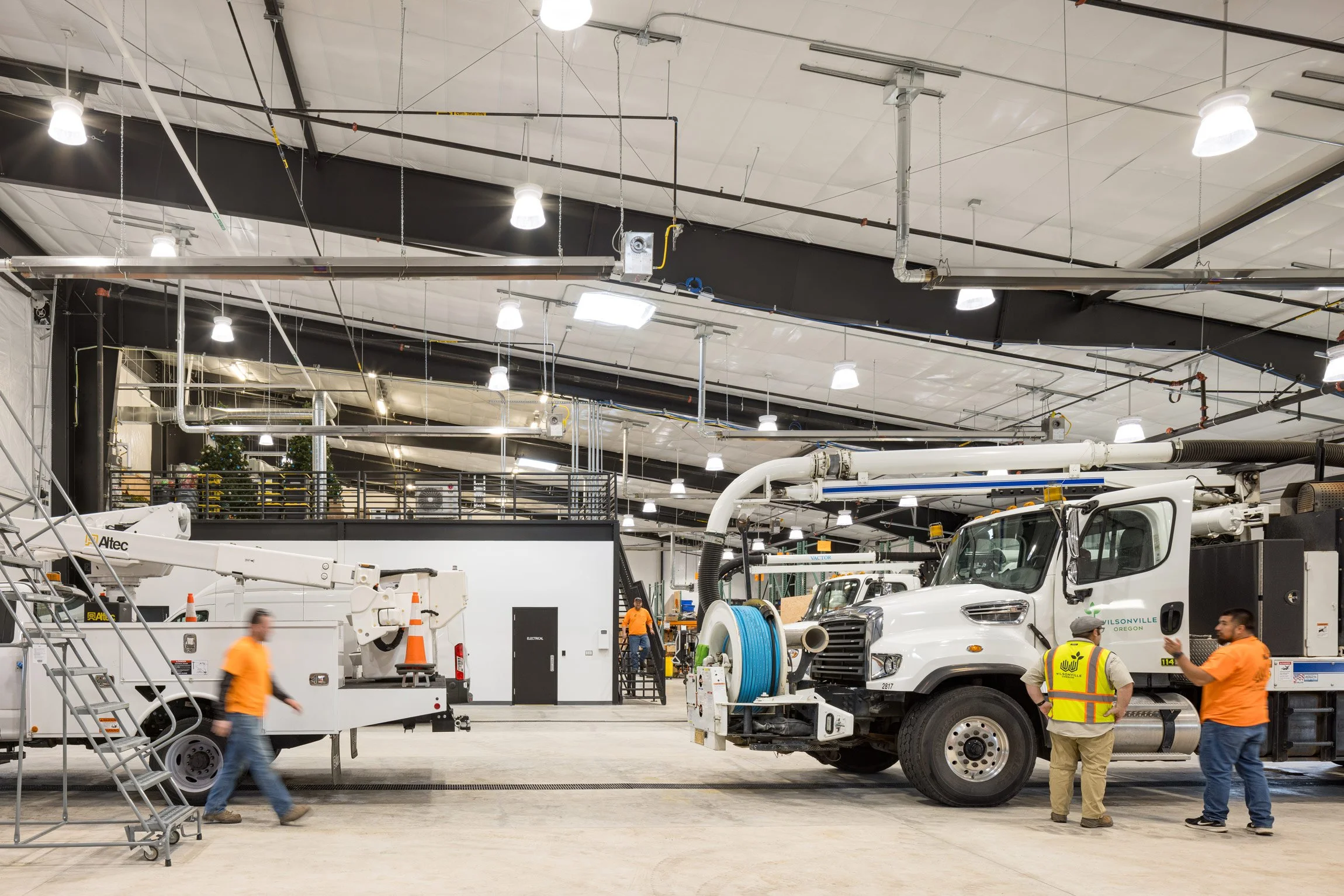 Across the courtyard is Building B, which houses the sign and wood shops, crew storage areas, and fleet maintenance vehicles. By using a shed roof, the building’s architecture accommodates a mezzanine for additional storage and positions it to support a considerable PV solar array. Building B is climate-controlled both for staff comfort and to ensure vehicles are never too cold to hinder deployment. Other campus buildings include a fleet vehicle wash station and a decant building, each taking cues from Building B’s industrial materiality.