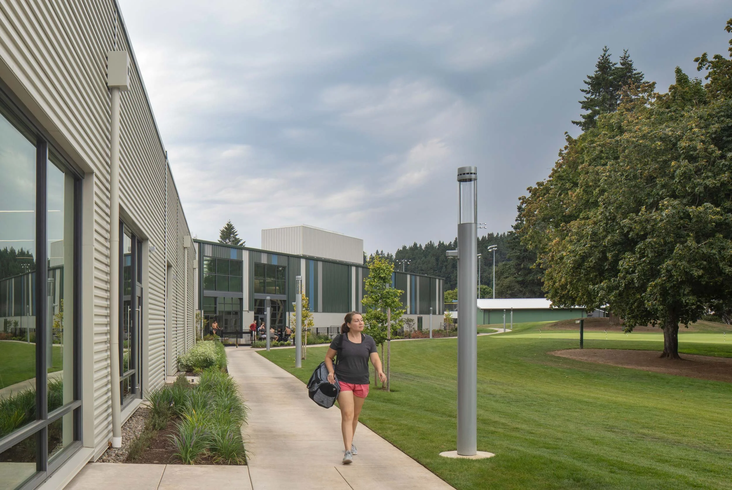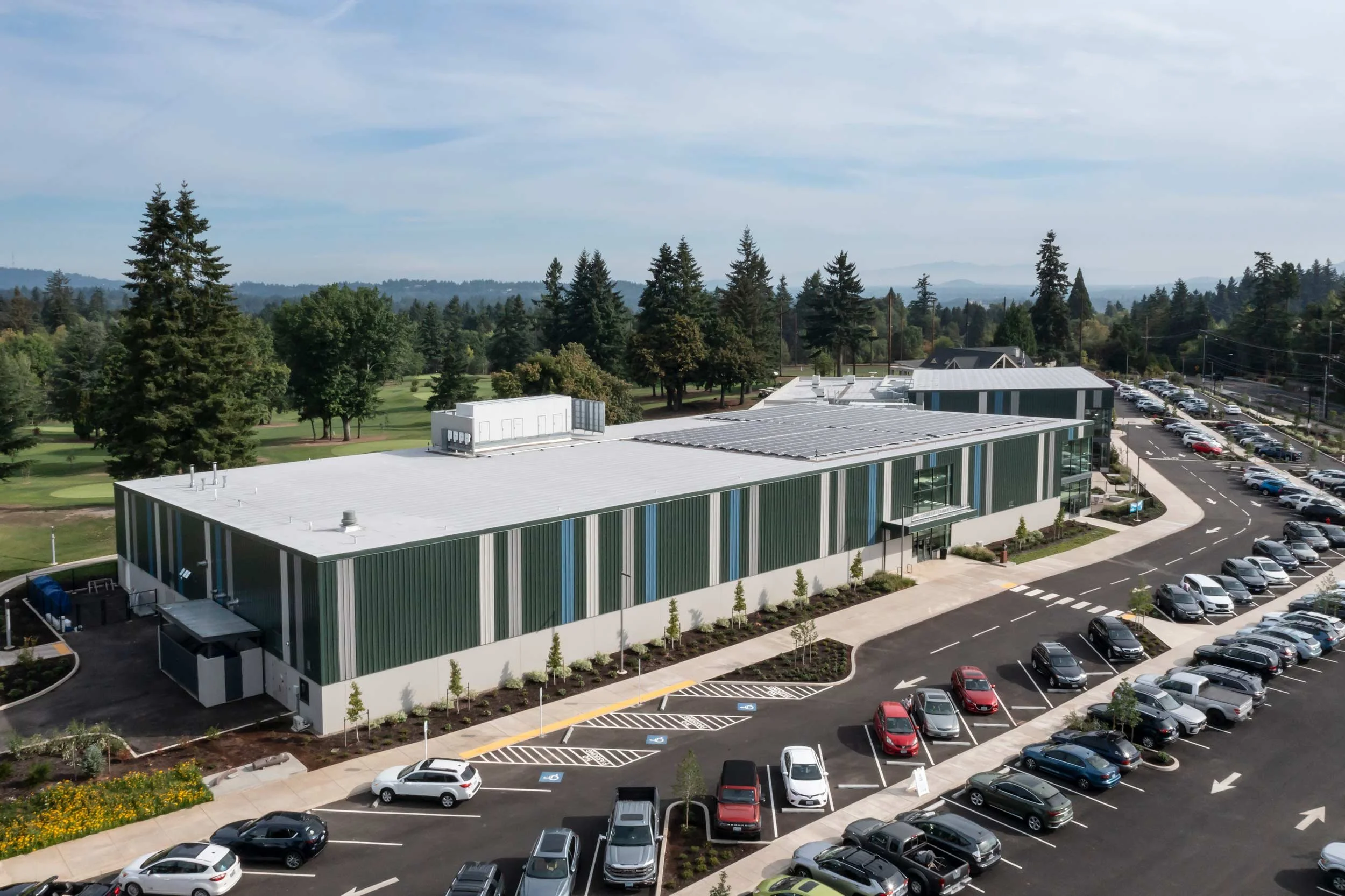 The LORAC is arranged in volumes, breaking down the scale of the large facility and making it more approachable. Smaller volumes, which contain the lobby, meeting rooms, locker rooms, fitness areas, and the City’s Parks and Recreation Department offices, are placed at the site entry. The scale and horizontal metal siding relate to the existing golf course clubhouse, now renovated as an event space known as Oswego Hall. The building lobby and main entry are wrapped in storefront glazing and operable overhead doors, connecting them to the golf course and outdoor plazas around the building.