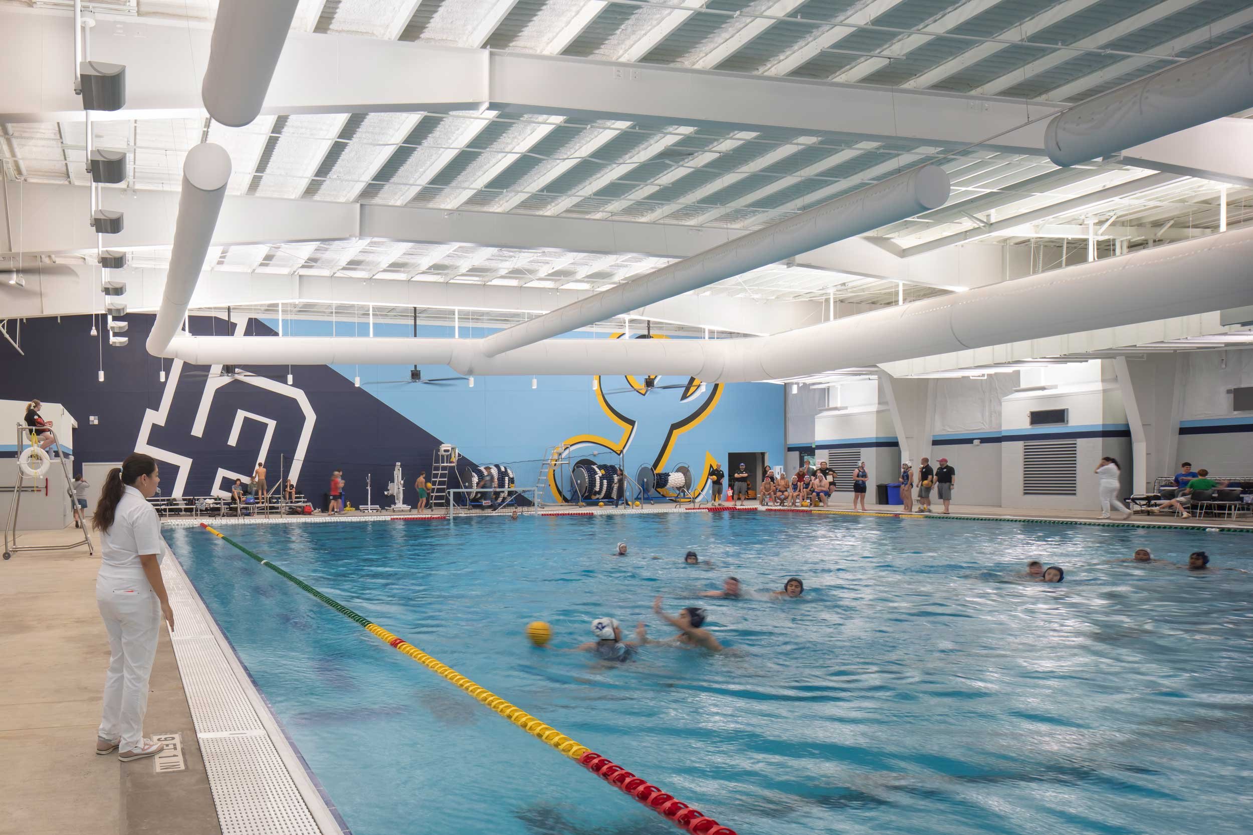 During water polo season, the competition pool is transformed from lap swimming to a regulation format for matches.