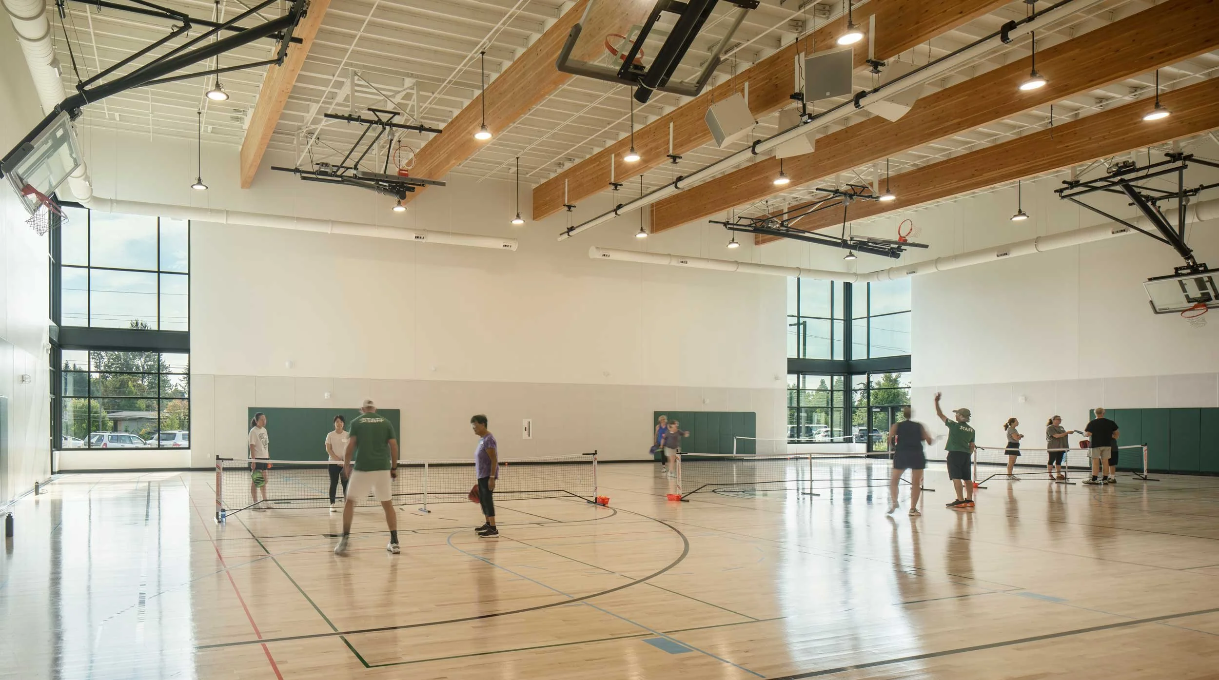The gymnasium accommodates a range of athletic pursuits, including basketball, pickleball, and volleyball, all popular in this community. The gymnasium also integrates audiovisual technology, with a sound system, projector, and projector screen available to support movie nights, school dances, and other community events, increasing the LORAC’s presence as an asset to Lake Oswego residents.