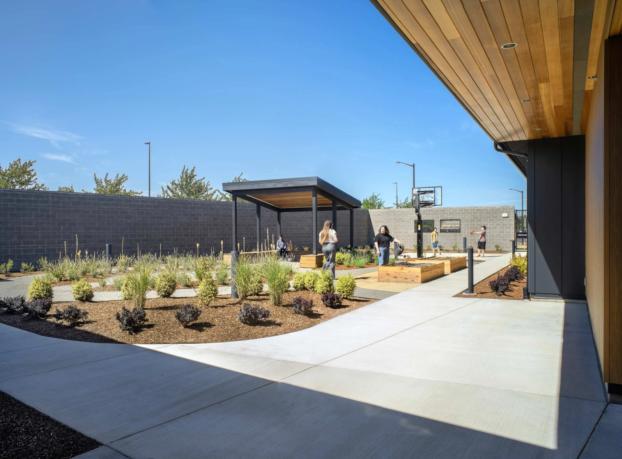 Exposure to the outdoors is an important component of healing. Jory Behavioral Health’s large exterior courtyard offers space for numerous activity types, including a basketball court, a covered seating area, planter boxes for gardening, and a meandering, landscaped meditation path. The wall surrounding the courtyard is tall enough to mitigate elopement but still allows views of the open sky and nature.