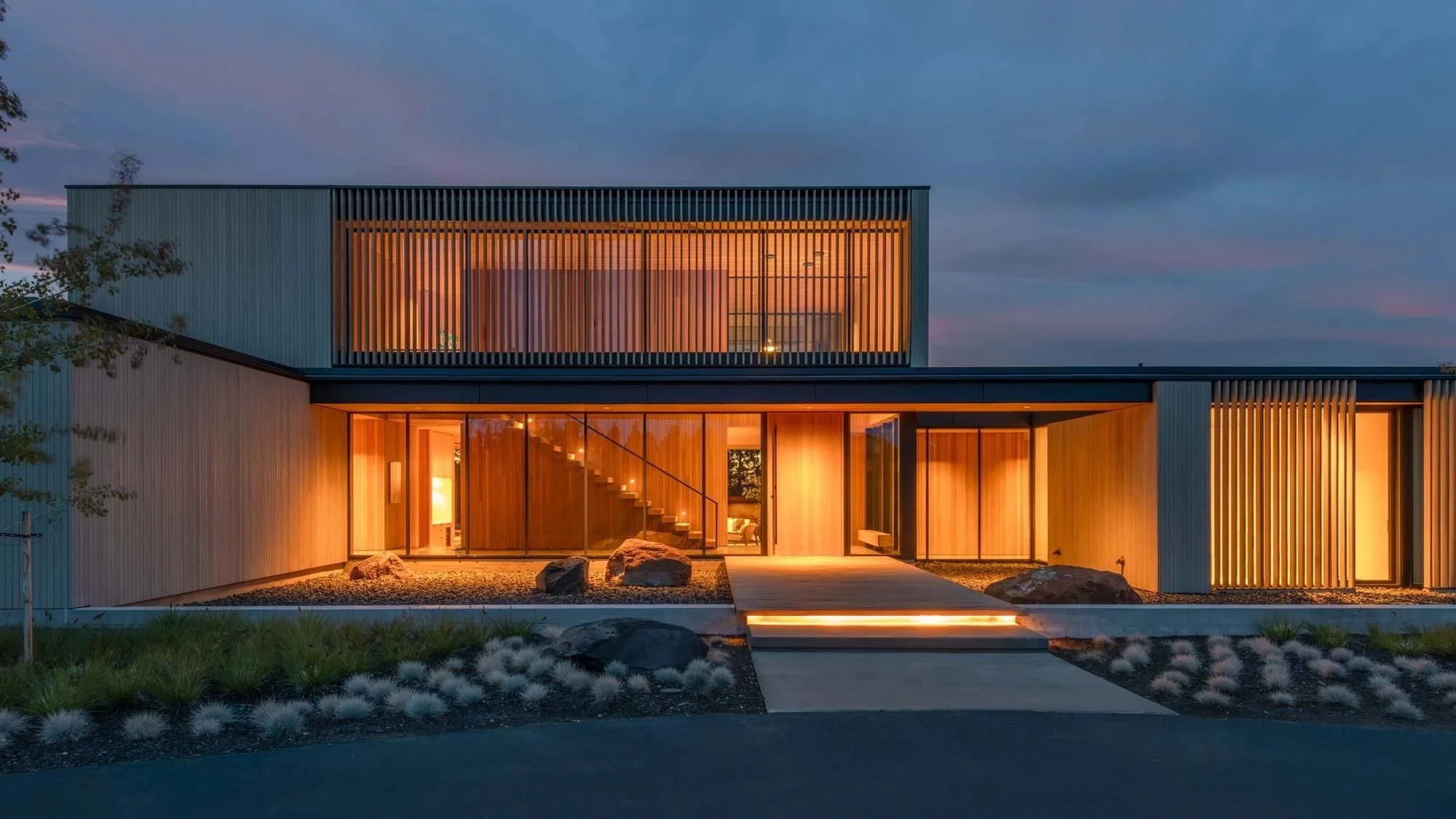 True to its Central Oregon roots, the home sits upon a plinth of board-formed concrete. Vertical tongue-and-groove wood siding quietly reflects the existing trees in the landscape.