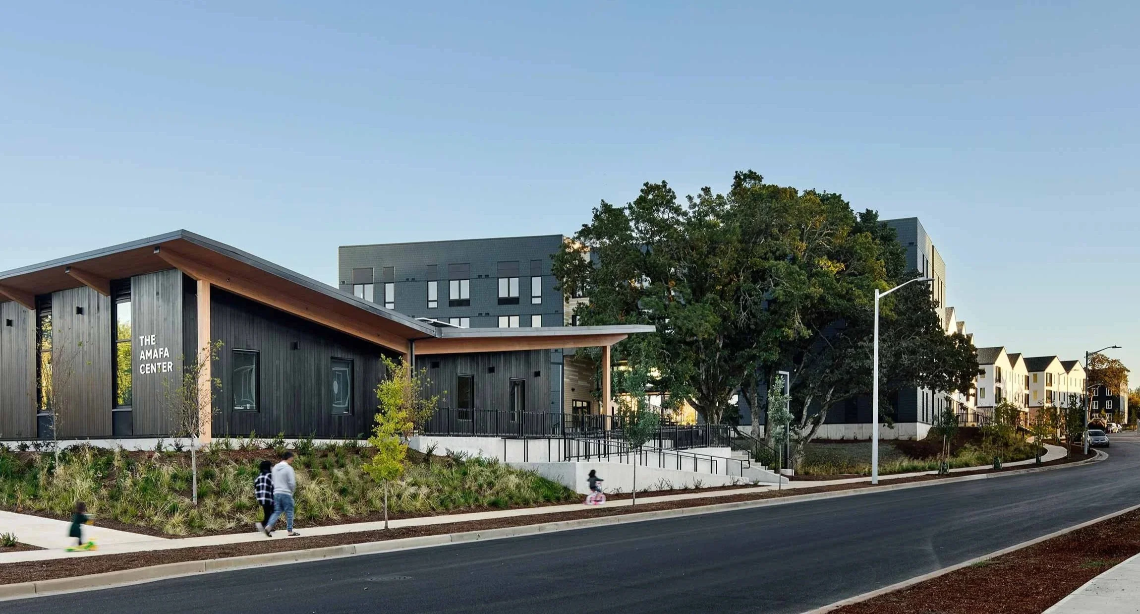 Mahonia Crossing is a mixed-income “Community for All Ages” housing development in Salem, Oregon, that uses design to promote connection. The development’s building typologies include family-centered residential walk-ups, a senior living building, and a community building—each responding to the differing needs of residents in 30, 60, and 80 percent AMI brackets. The integrated architecture and interior design approach supports indoor-outdoor living, incorporates art into daily life, and creates opportunities for a series of passive and active multi-generational interactions. Mahonia Crossing is National Green Building Standard Gold-certified and features a Path-to-Net-Zero community building, integral to the development’s focus on sustainability.