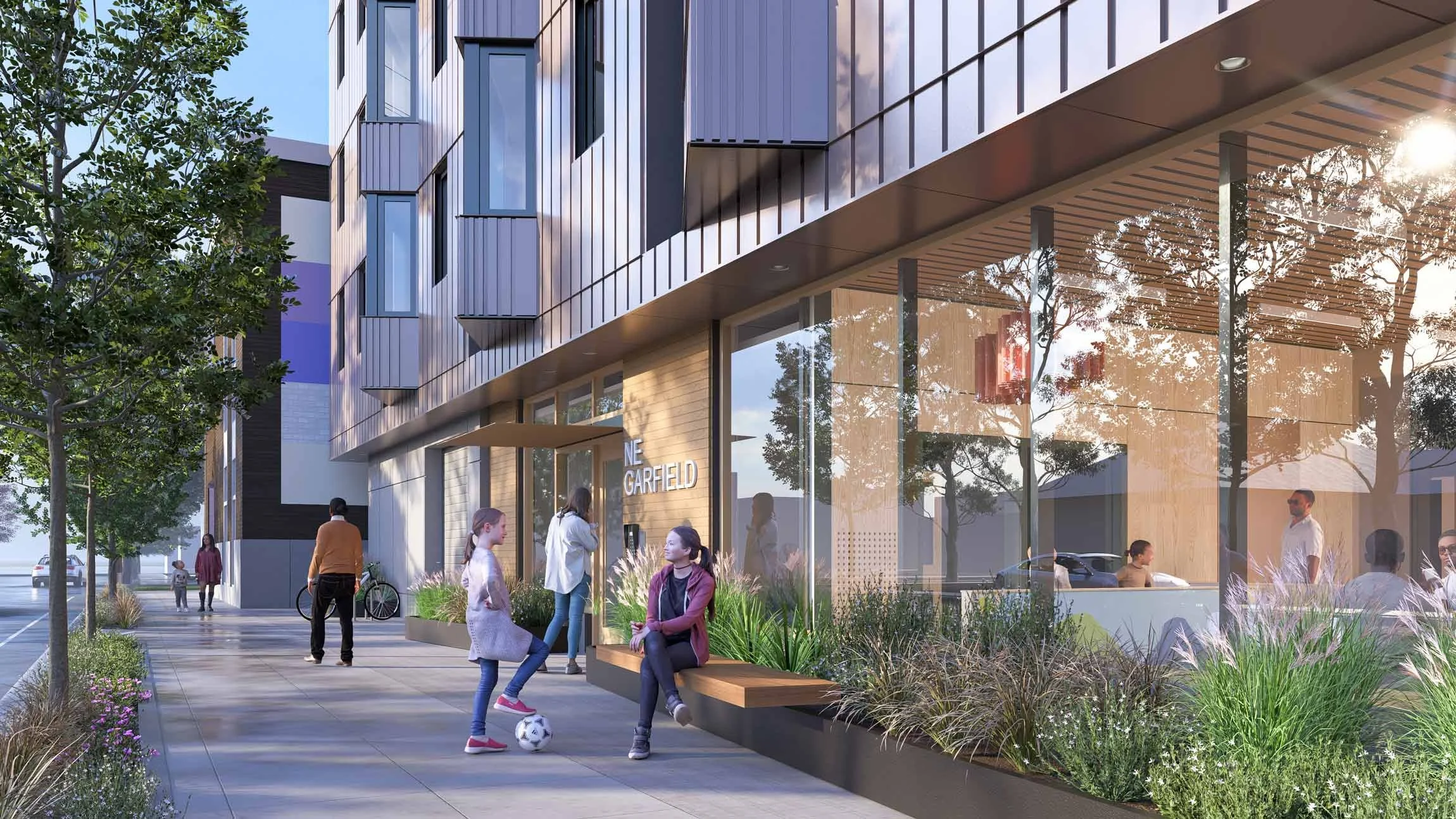 NE Garfield Affordable Housing is an infill development with an uplifting, welcoming presence in its Northeast Portland neighborhood. As one of Self Enhancement, Inc.’s first housing developments (and in partnership with Edlen & Co.), their vision for the building is to signify new hope for the neighborhood and those residing within, specifically African Americans and underserved families who are able to move back into this gentrified neighborhood. Scott Edwards Architecture is partnering with Curious Architects to deliver a mix of studio, 1, 2, and 3-bedroom floorplans across 59 apartments, offering a variety of layouts suitable for a range of family sizes. Shared amenities like a communal room with a kitchenette and children’s play area, distributed laundry rooms on each floor, and an outdoor courtyard extend what defines ‘home’ to include areas outside of individual residences, promoting connection and activity. Longevity is emphasized through flexibility of spaces, thoughtful material choice, and sustainability measures targeting NGBS Emerald certification.