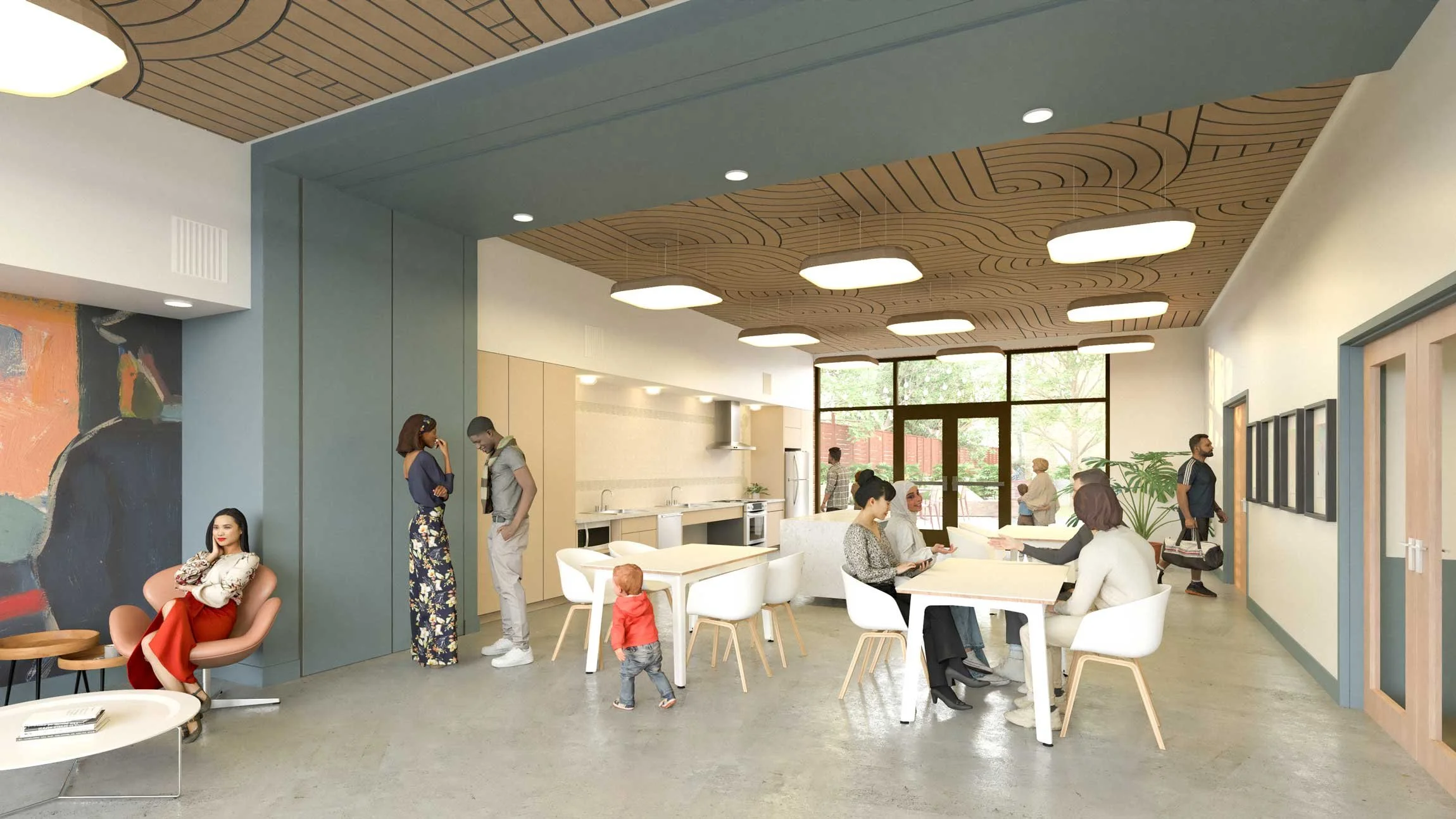The Nicole Sandoval Building applies universal and accessible design to enhance the ability of all residents to navigate shared spaces. The interior design concept is understood through a blending of contemporary modern design with traditional elements and character. This approach brings the feel of the Alberta neighborhood into the lobby, community room, and corridors, crafting a strong sense of place and connection. Creating a healthy interior environment for residents and staff was prioritized through the application of low-VOC materials, and in response to the client’s desire for durability, SEA was intentional in the treatment of walls, ceilings, and floors in high-traffic areas, specifying design solutions with longevity in mind.