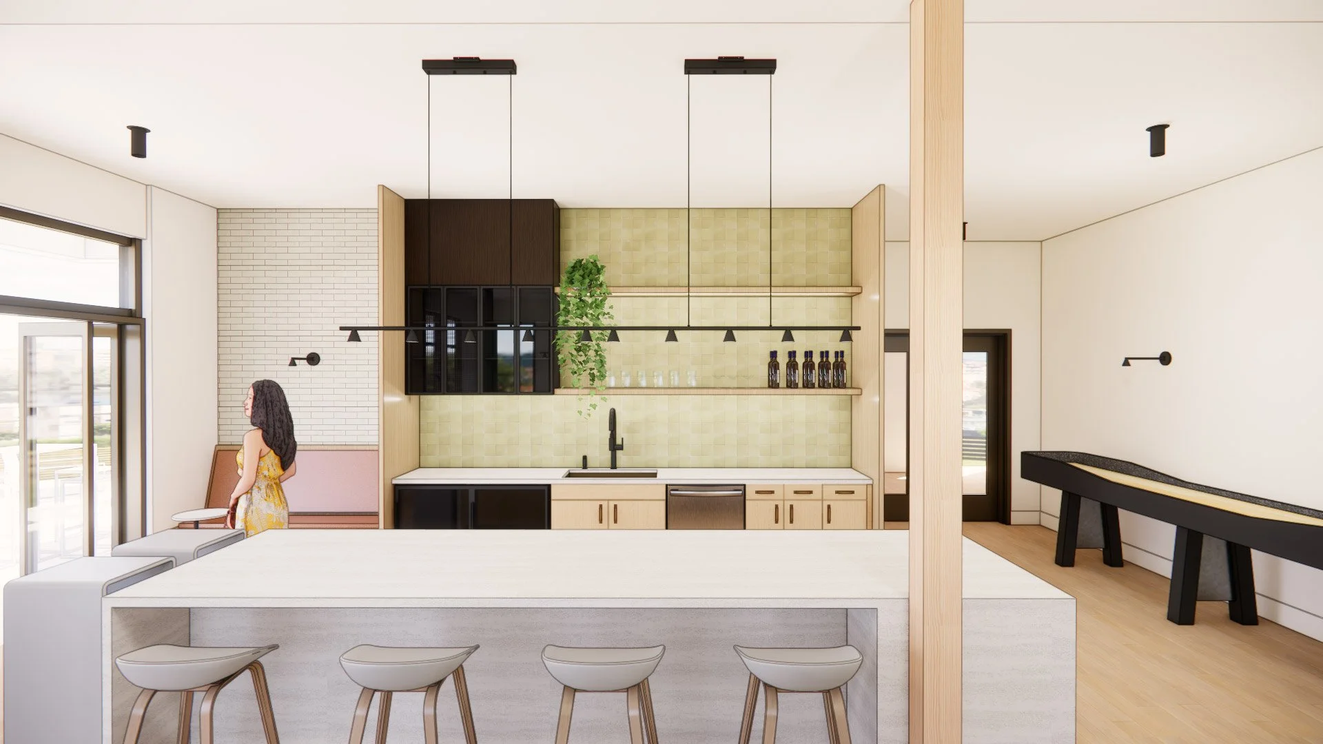 An amenity Clubhouse is placed across a plaza from the residential building. The plaza features lush landscaping, raised planters, seating, site lighting, and is envisioned as a conductor of activity as residents spill in and out of the building and through the Clubhouse. The Clubhouse juxtaposes the residential building’s contemporary materials with timeless materials that are simple in nature and in close relationship to the mass plywood roof structure. The West facade is reminiscent of an old brick factory or pump house, and the opposite side is wood. The design intent is that this structure has been repurposed as a social space, adding visual interest and character.
